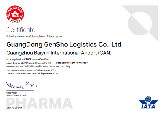2021年9月28日,广东原尚物流股份有限公司荣获国际航空协会(IATA)医药物流独立验证卓越中心颁发的CEIV